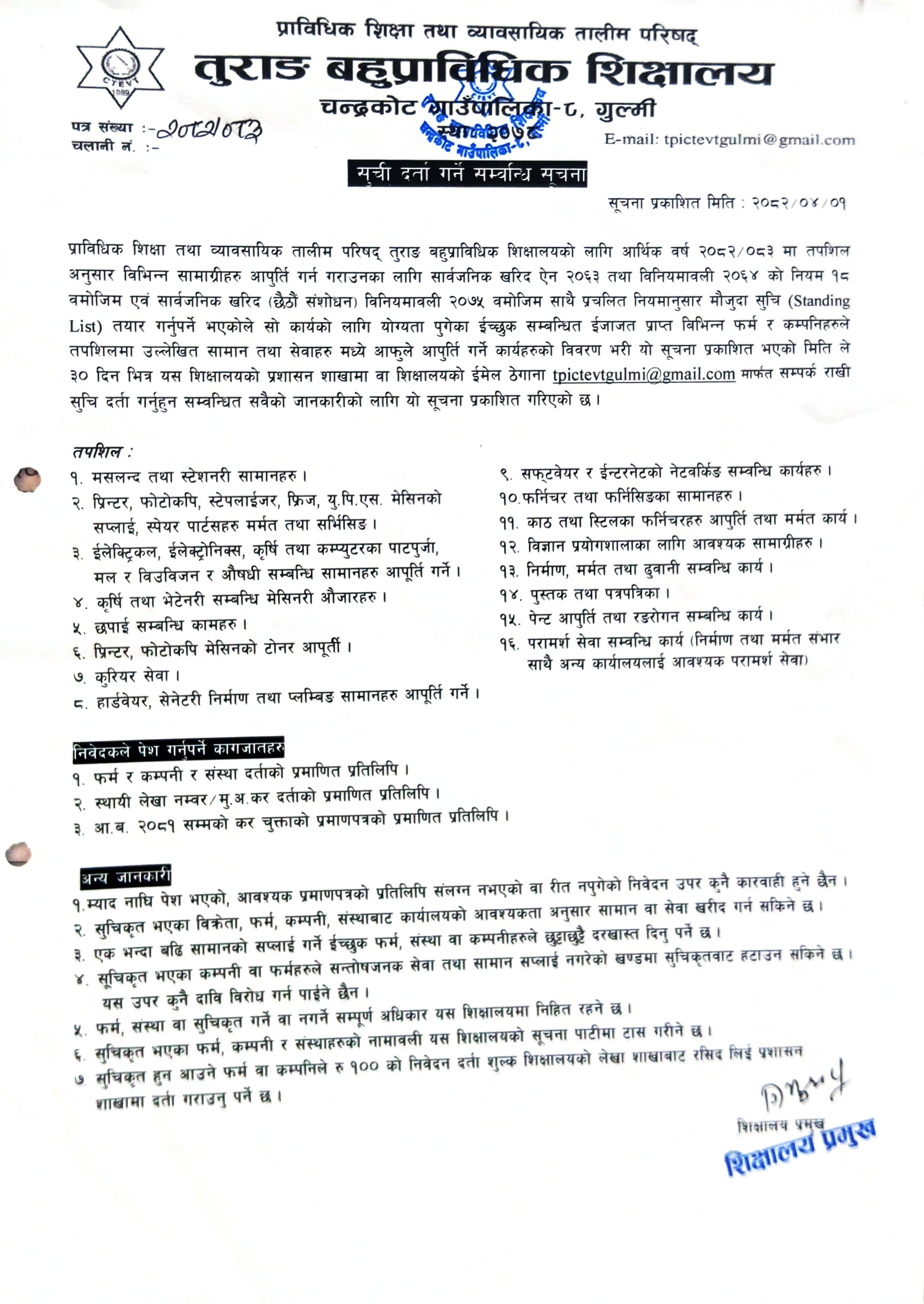 भर्ना खुल्यो!भर्ना खुल्यो!!भर्ना खुल्यो!!! CTEVT को आफ्नै आंगिक शिक्षालयमा शैक्षिक सत्र २०८२/२०८३ को लागि भर्ना खुलेको साथै गुल्मी जिल्लाका विभिन्न स्थानीय तहले छात्रावृत्ति उपलव्ध गराएको समे |