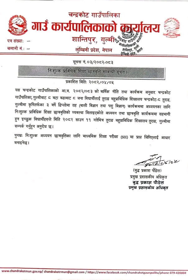 चन्द्रकोट गाउँपालिकाको नि:शुल्क प्राविधिक शिक्षा छात्रवृत्ति सम्बन्धि सुचना |