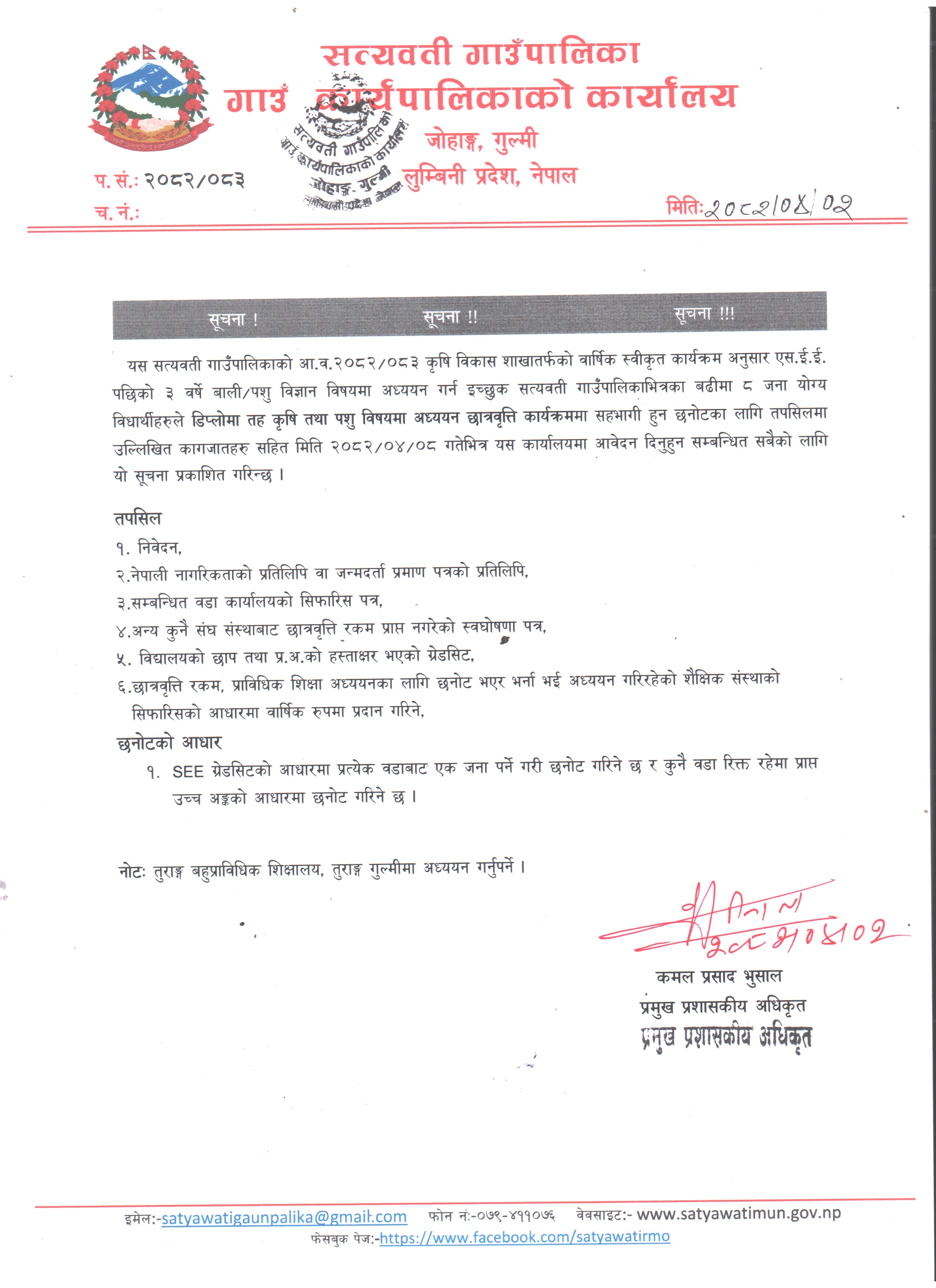 सत्यवती गाउँपालिकाको नि:शुल्क प्राविधिक शिक्षा छात्रवृत्ति सम्बन्धि सुचना |