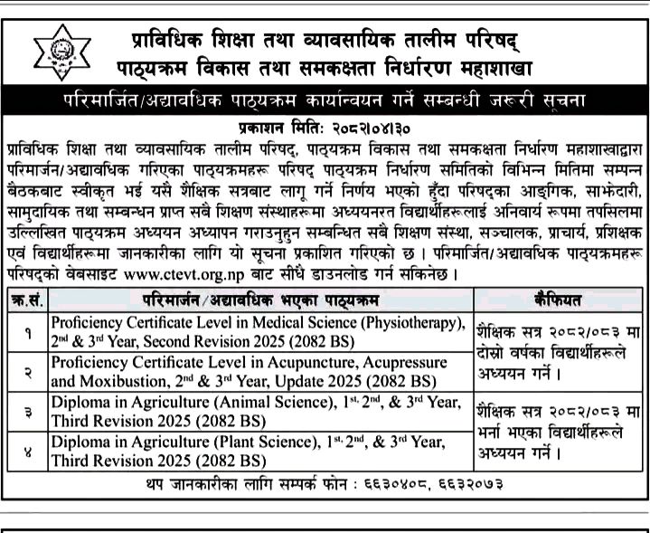 पाठ्यक्रम परिमार्जित भएको सम्बन्धि जरुरी सूचना...CTEVT द्वारा शैक्षिक सत्र २०८२/०८३ देखि लागु हुनेगरी परिमार्जित/अधवाधिक भएका पाठ्यक्रम कार्यान्वयन गर्ने सम्बन्धि जरुरी सुचना.... |
